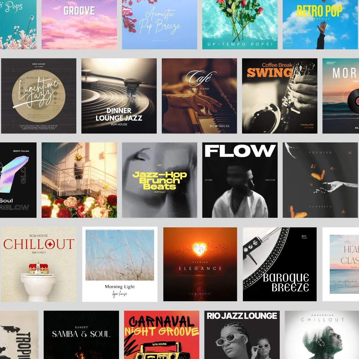 ジャズ・カフェ系・洋楽ポップ・ラウンジなど、業種別の定番テイストを網羅。季節や時間帯に合わせて必要な雰囲気がすぐ見つかります。